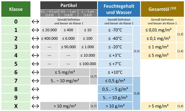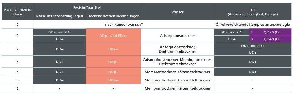 Je nach Anforderung der Durckluftanwendung ergibt sich eine geforderte Druckluftqualitätsklasse gemäß ISO 8573-1:2010.