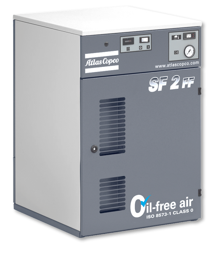 Ölfrei verdichtender SF-Scrollkompressor SF 1 FF mit integriertem Kältetrockner - Diese nach ISO 8573-1 Klasse 0 zertifizierten Kompressoren liefern 100 % ölfreie Druckluft, unkompliziert im Betrieb, sind leicht zu warten und können platzsparend installiert werden. SF-Kompressoren verhindern eine Verunreinigung mit Öl und sind eine effiziente, zuverlässige und äußerst kosteneffektive Quelle reiner, ölfreier Luft.